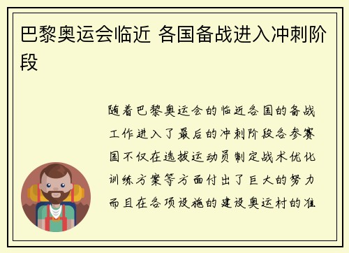 巴黎奥运会临近 各国备战进入冲刺阶段